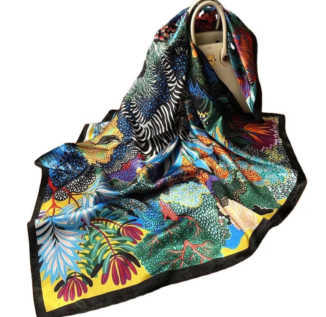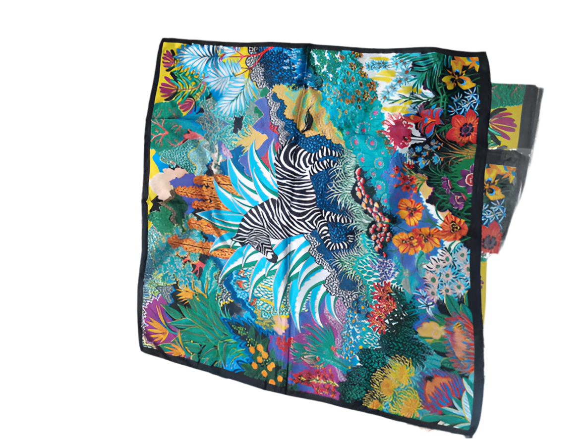 Embrace the vibrant beauty of nature with the Wild Oasis scarf. Featuring a bold fusion of vivid colors and intricate patterns, this silk masterpiece evokes the energy of a tropical garden in full bloom. The harmonious mix of stripes, florals, and lush foliage creates a striking, yet sophisticated look that can elevate any outfit. Whether styled as a head wrap, necktie, or handbag accessory, this scarf offers versatile elegance, making it a must-have for those who dare to stand out in style.